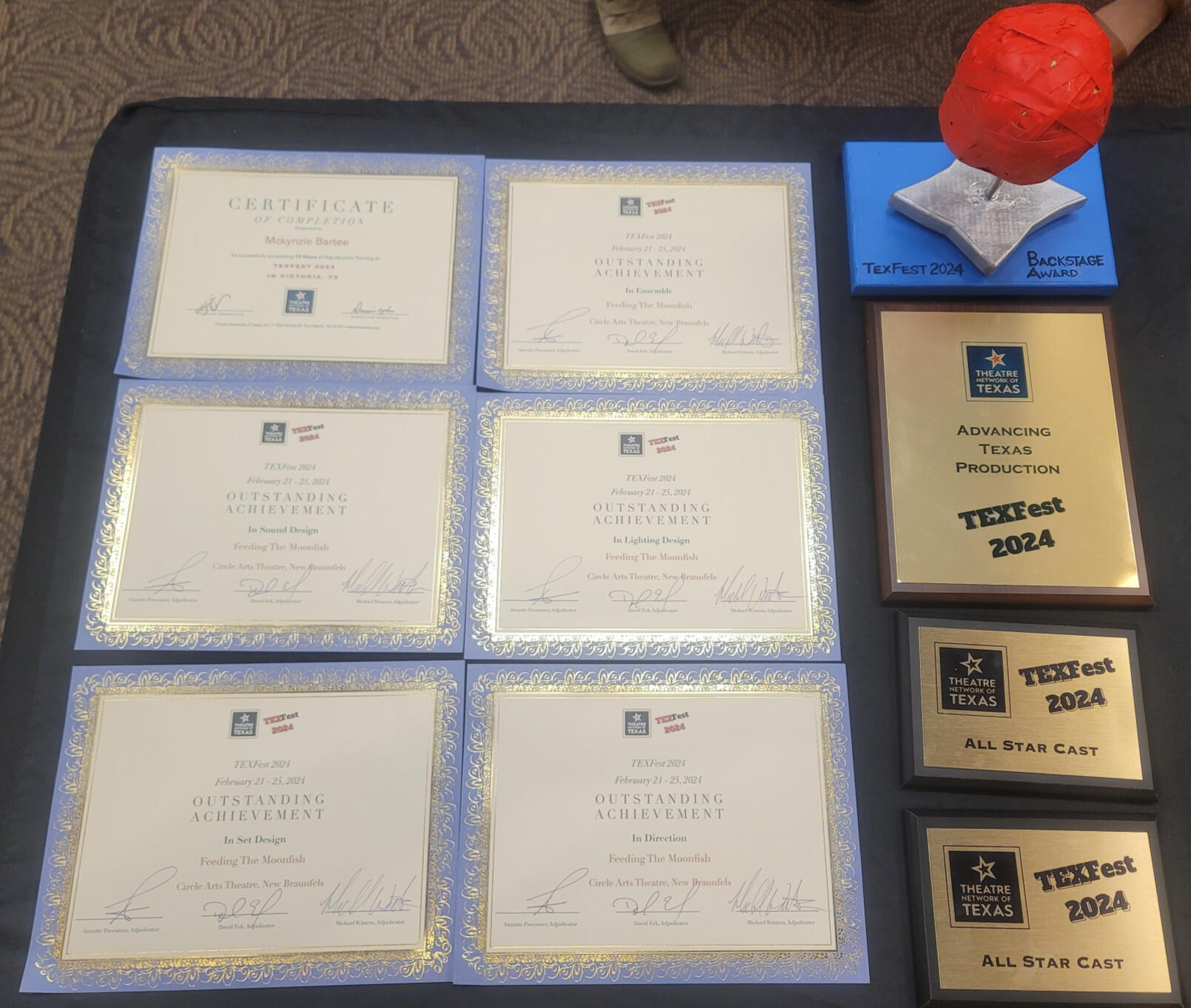 I’m proud of the work I’ve made and the recognition it has received, especially when that recognition reflects strong team work and strong storytelling. Feeding the Moonfish was awarded Outstanding Achievement in Direction, Outstanding Achievement in Ensemble, and Outstanding Achievement in Set Design at AACT TexFest. I’ve also been nominated for Best Direction of a Musical and Best Supporting Actress of a Musical by Broadway World Austin, and I was nominated for Outstanding Senior Woman at Texas State University. I take awards as a bonus, not the point, but I do think they can reflect when a production’s choices and execution really landed.Awards and Nominations*Outstanding Achievement in Direction – Awarded by AACT*Outstanding Achievement in Ensemble – Awarded by AACT*Outstanding Achievement in Set Design – Awarded by AACTNominated for Outstanding Senior Woman at Texas State University by Natalie BlackwellNominated for Best Direction of a Musical – Broadway World AustinNominated for Best Supporting Actress of a Musical – Broadway World AustinNominated for a feature in the Marquis Who’s Who in America